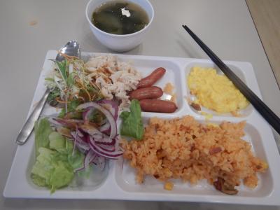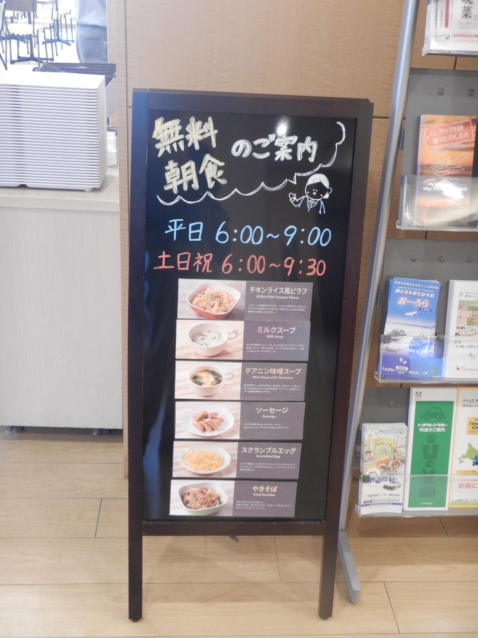 朝食無料。ピラフ、焼きそば、スクランブルエッグ、ソーセージ、みそ汁、スープ、パン、フルーツ、サラダなど。無料にしてはよい方だろう。- 旅行時期