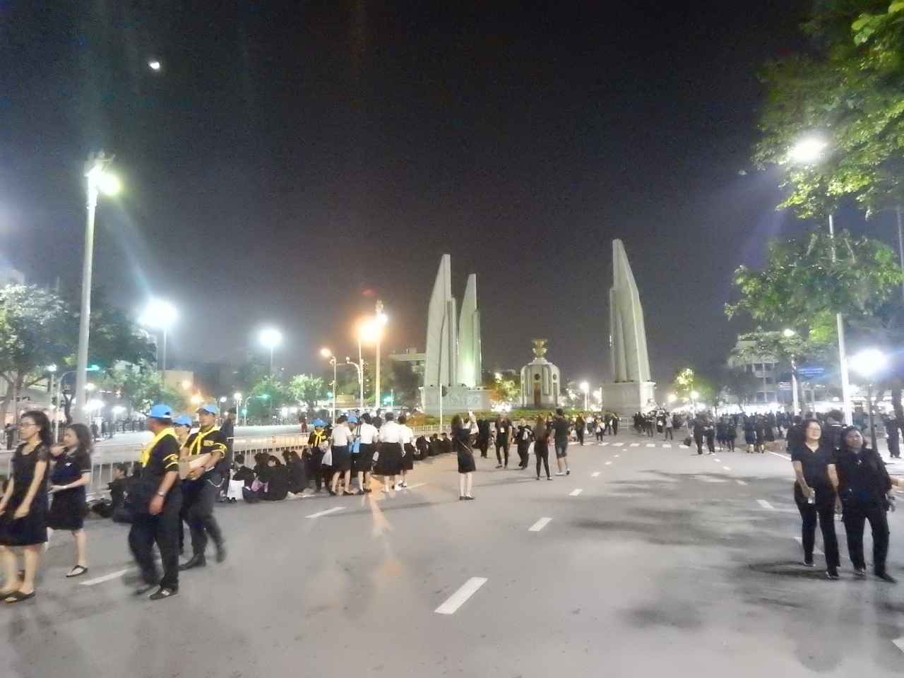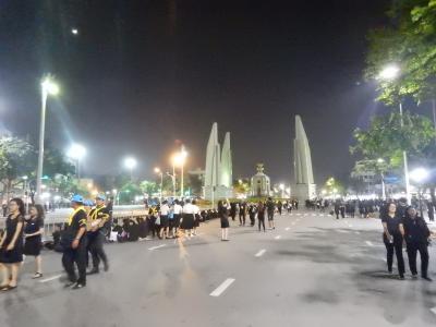 2017年10月26日は国王の火葬式である本葬儀が行われた日だ。王宮に近い民主記念塔付近のラチャダムヌンクラン通りは通行止めになっており、喪服姿で国王の冥福を祈る人たちで一杯だった。臨時の照明が設置され、昼間のように明るかった。