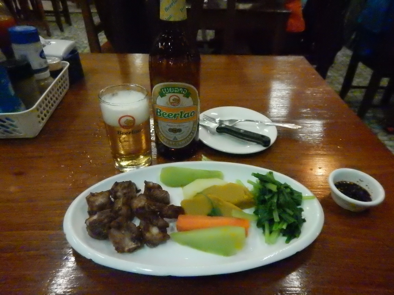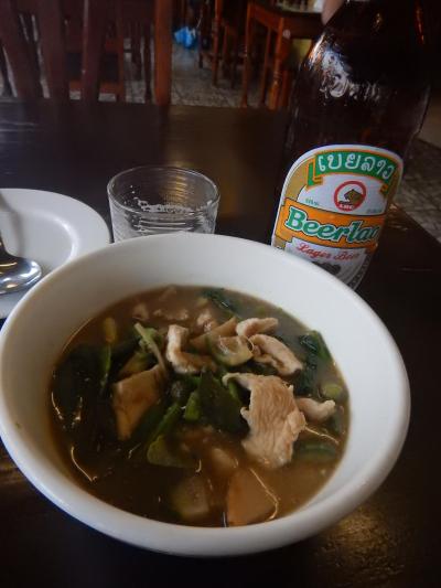 初日は遅めの昼食にラオスープチキンで軽くビールを1本飲む。計3万キープ。2日目骨付きの豚肉野菜を茹でたものビール。これは肉が少なく骨ばかりだった。3日目は利用せず、4日目は写真はないが、朝からバスで移動するので、サンドイッチをテイクアウトした。