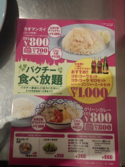 バンコクのガイトーン・プラツーナムでは何度もカオマンガイを食べているので、果たして日本ではどうかなと思い、食べてみた。まず値段。バンコクでは40バーツ(約130円)だ。ご飯の量は日本の方が少し多い気がする。肉とご飯はまあまあ。スープの胡椒が入っていないのがよい。タイだとどこの店でもたくさん入っている。パクチー食べ放題は日本だけ。タイではスープに多少入っている程度。それよりもスープをお代わりを無料でできるようにしてほしい。