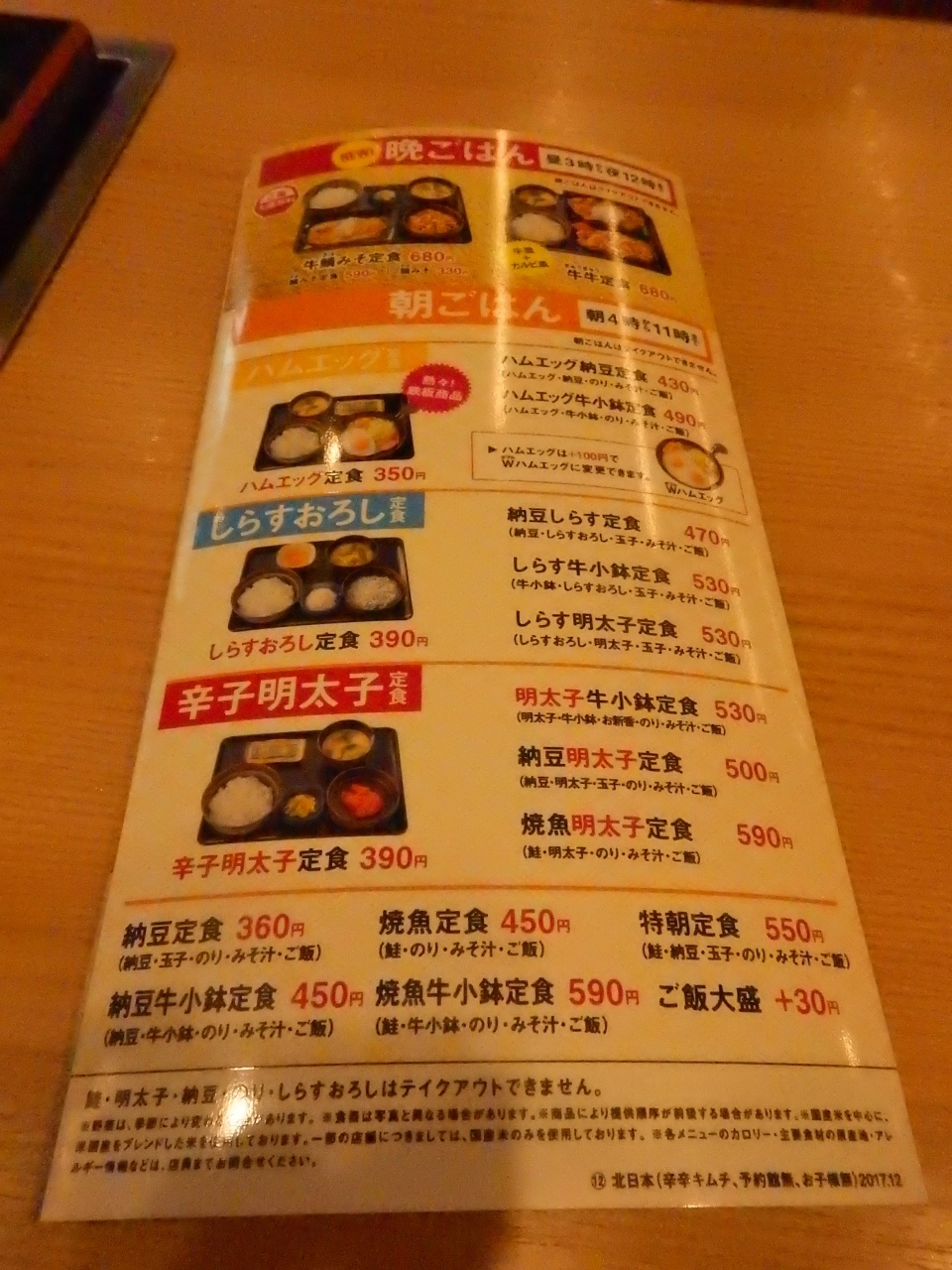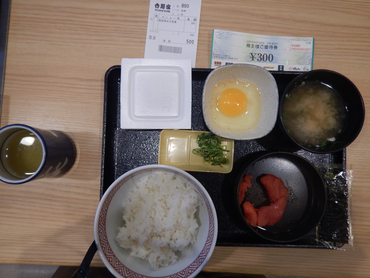 「朝ごはん」のメニューの中かた「納豆明太子定食」を選択。納豆、明太子、生卵のおかず。まずいわけはない。ただ、おかずのわりにご飯少なかった。ご飯を大盛りにできるならした方がよかった。支払いは株主優待券を1枚利用。差し引き200円。WAONで支払った。