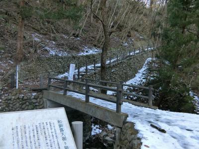 「和銅採掘露天堀跡」への道④モニュメントの近くにある説明と、橋。夏なら...