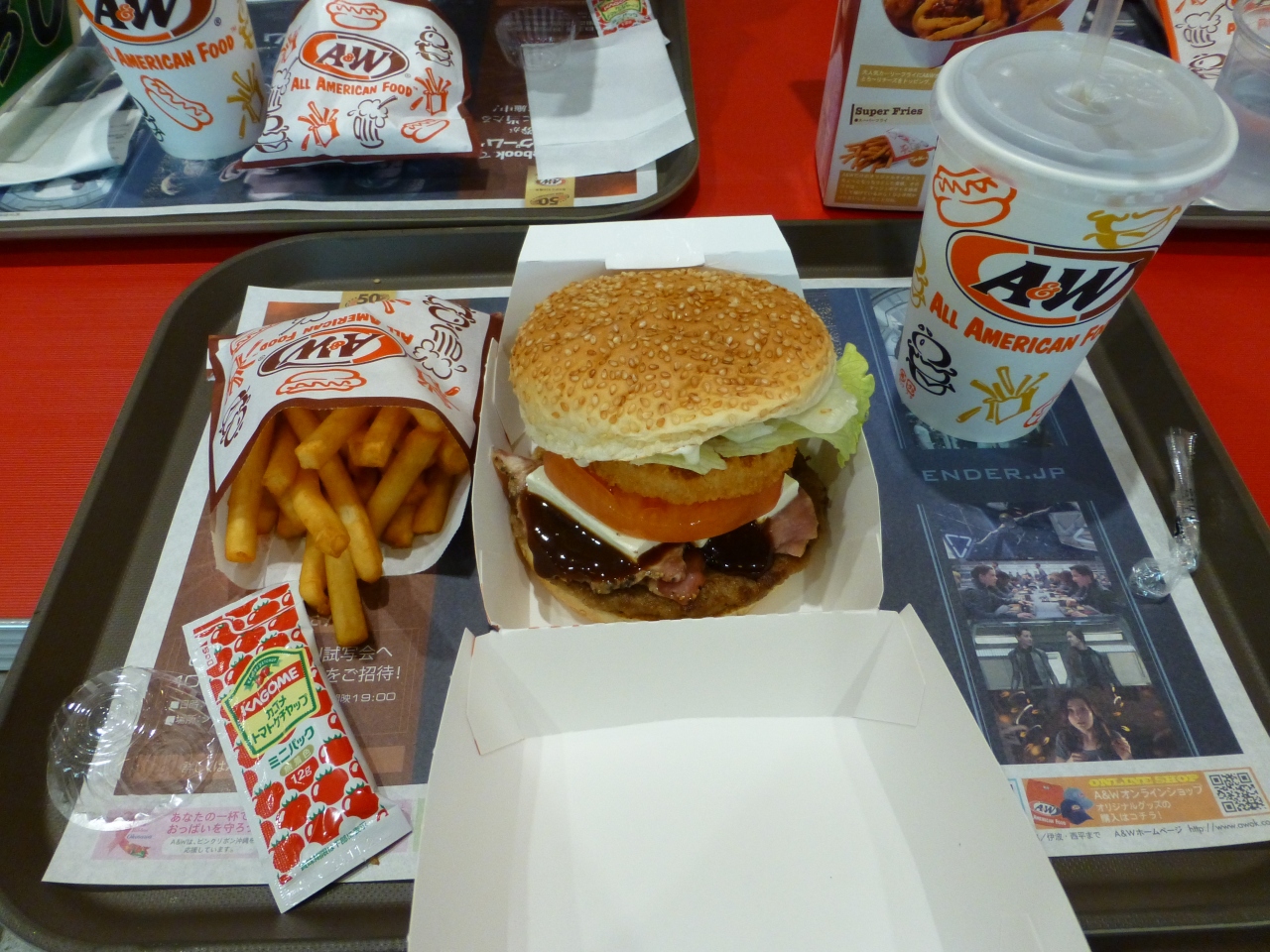 パテにクリームチーズ、トマト、フライドオニオンの入ったボリューム満点のA&Wバーガーにしました。