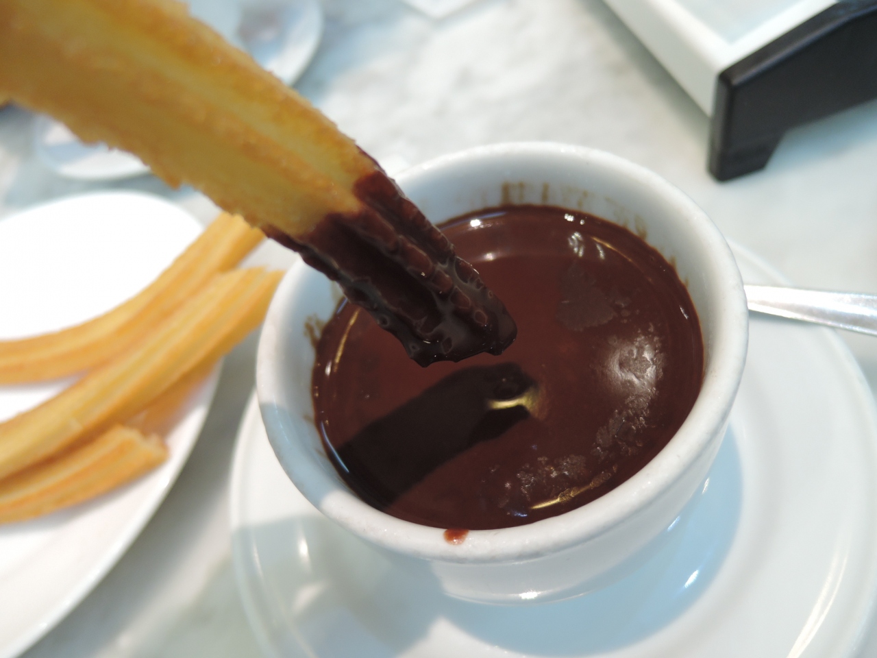 揚げたてのチュロスにとろとろのチョコラーテを漬けて食べました。