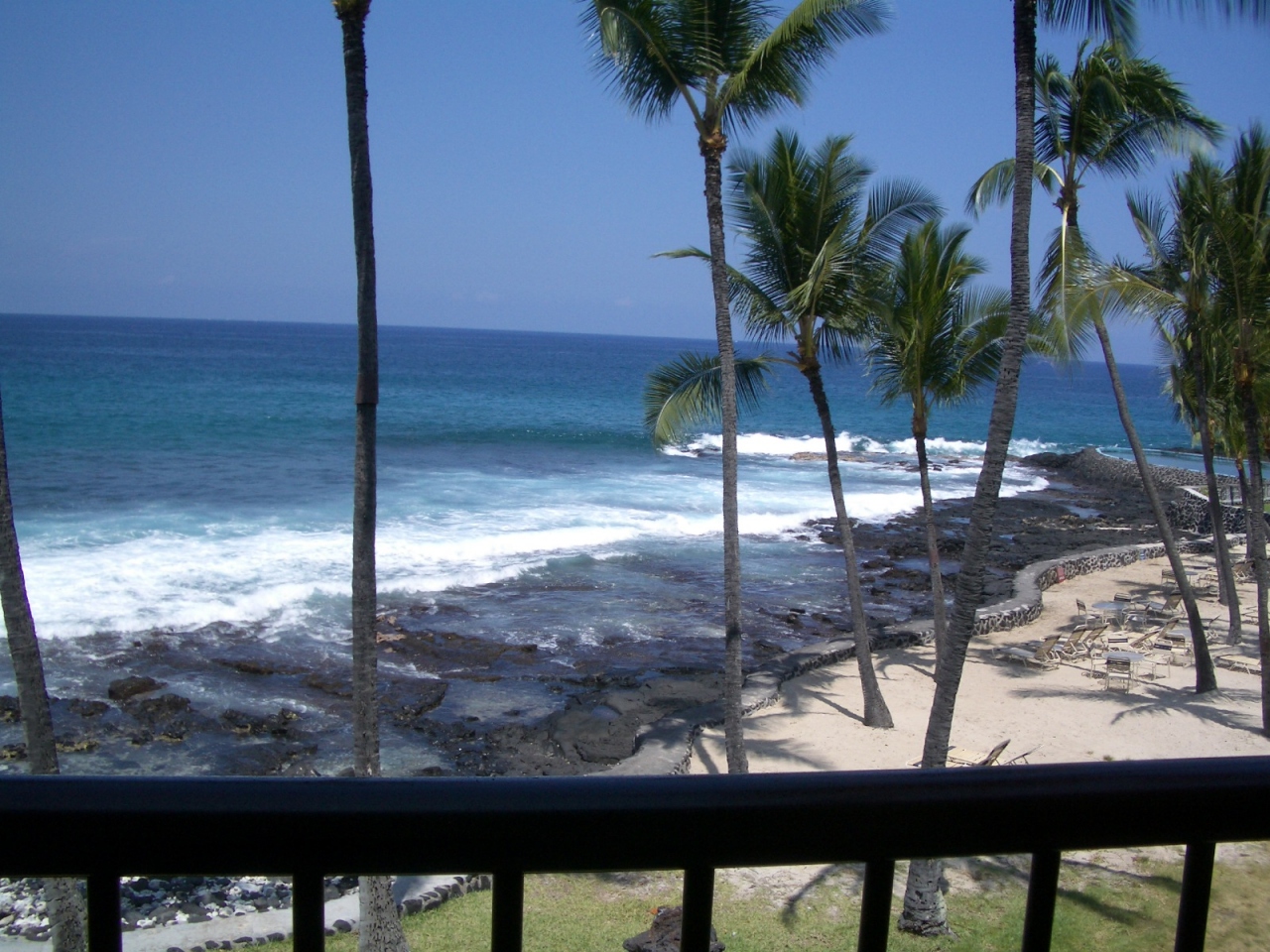我々の207号室は1ベッドルーム2バス、100?超の広い間取りで、2人にはもったいない位だ。部屋内に洗濯機・乾燥機が付いているのも便利。エアコン完備(各戸で温度調節可・ただし華氏表示なので、勘が頼りかも)。バスルームが2つあると朝のシャワー・洗面・トイレ争奪も無く優雅に過ごせる。当然毎日のタオル交換、清掃サービスあり。こだわったオーシャンフロントは、まさに海正面。リビング奥の対面式キッチンからでも波打つ海が見渡せる。窓を開けるとうるさいくらいだ。地下駐車場にジュースの自動販売機あり。また、コンドからコナ中心部に向かって徒歩1分程のところにデリ・飲み物・簡単なお土産を扱うお店があった。