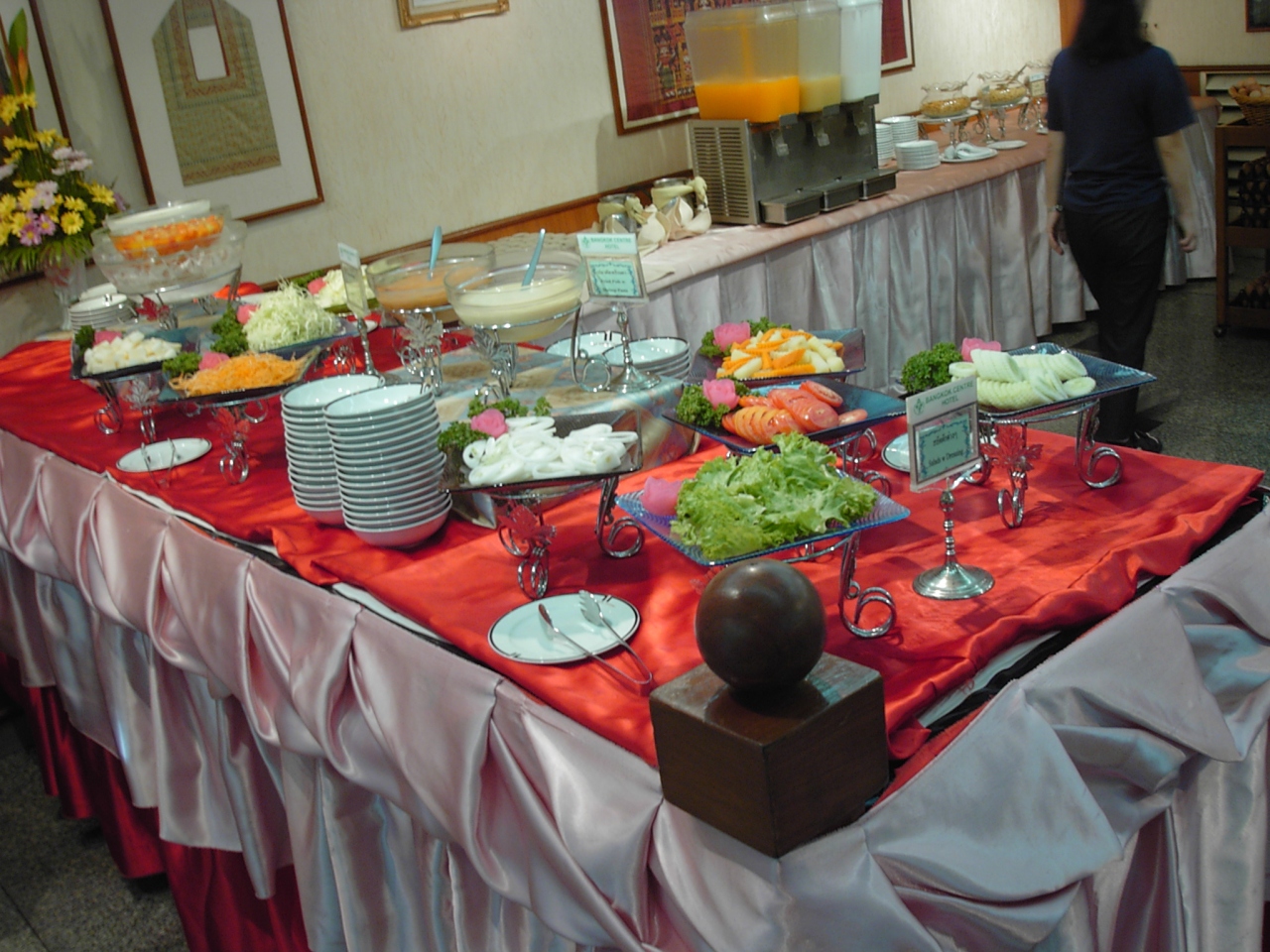 ホアランポーン駅前の屋台で朝食。センレック・ナーム(中細の汁有麺)当時25B。自分好みに仕上げて食べる。ホテル前にはこのほかに中華まんのようなものを売る屋台などいくつか食べられそうな屋台があった。写真はホテルの朝食バイキング。- 旅行時期