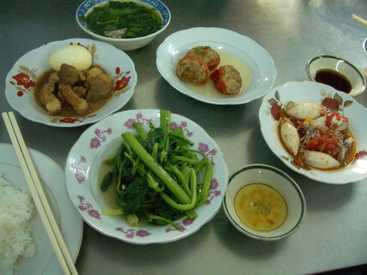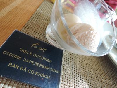 グエンフエ通りからトンタップティエット通りに入ったCom Ba Caで昼食。ここはベトナムの大衆食堂。たくさんあるおかずの中から好きなものを指差し注文していく。我々は2人でおかず4品(豚の角煮、イカの詰め物、トマトの肉詰め、青菜炒め)とスープ2つを頼む。ご飯も付いて3.8万VND。ここはご飯の上におかずが載るのではなく、ごはんとおかずが独立した皿でサーブされる。ひっきりなしに客が来るが、ビニール袋に入れて持ち帰る人が多い。お袋の味的で日本人の口に良く合うと思うし、何より安価。言葉は通じないが身振り手振りで何とかなるものだ。昼食にお勧め。