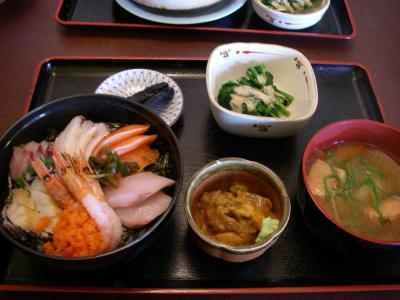 尻屋崎観光後、5kmほど八戸・むつ方面に戻った岩屋地区にある「食堂やまだい」をオススメします。ラーメンやカツ丼など定番メニューから、うに丼、海鮮丼など観光客が喜びそうなメニューまで多彩。地元の方から観光客までお客さんがよく回転していて、飛び込みで入った私達のほうが驚いてしまいました。前日の仏が浦観光の際、ぬいどう食堂が満席で利用できなかったので、今回はうれしい誤算でした。海鮮丼2000円とまつも鍋定食1000円を食べました。海鮮丼は、白身魚刺身2-3種類と甘えび、サーモン、あわびと別小鉢に生うに。うにに醤油を合えて、海鮮丼にかけて混ぜて食べると美味しいとお店の方に教えてもらいました。海鮮丼は半分そのままで、残りをウニと合えて食べましたが、絶品です。まこも鍋定食は、マコモという海草と豆腐、うに、ほたて、たこなどを鍋仕立てにした定食で、潮の香りのするこれまたご飯に合う鍋でした。