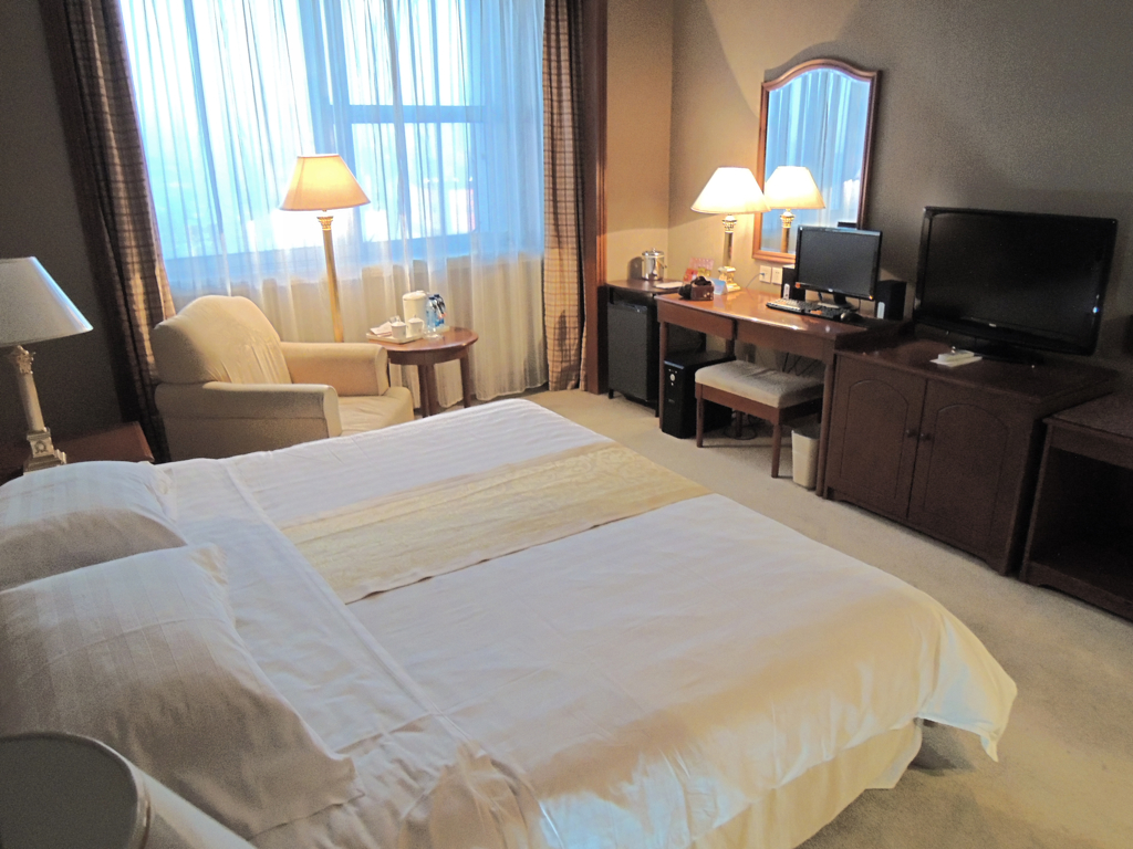 ホテル全体の設備ですが、中国国内の5つ星ホテルでパッと見た感じは良いホテルに見えますが、よく見るとホテル自体がかなり老朽化していて客室のドアの木枠などがボロボロになっている部分がありました。外の音はほとんど聞こえて来ませんが、隣の部屋の音が結構聞こえてきます。部屋にはテレビの他にデスクトップパソコンが1台設置されていてインターネットも出来るようになっています。