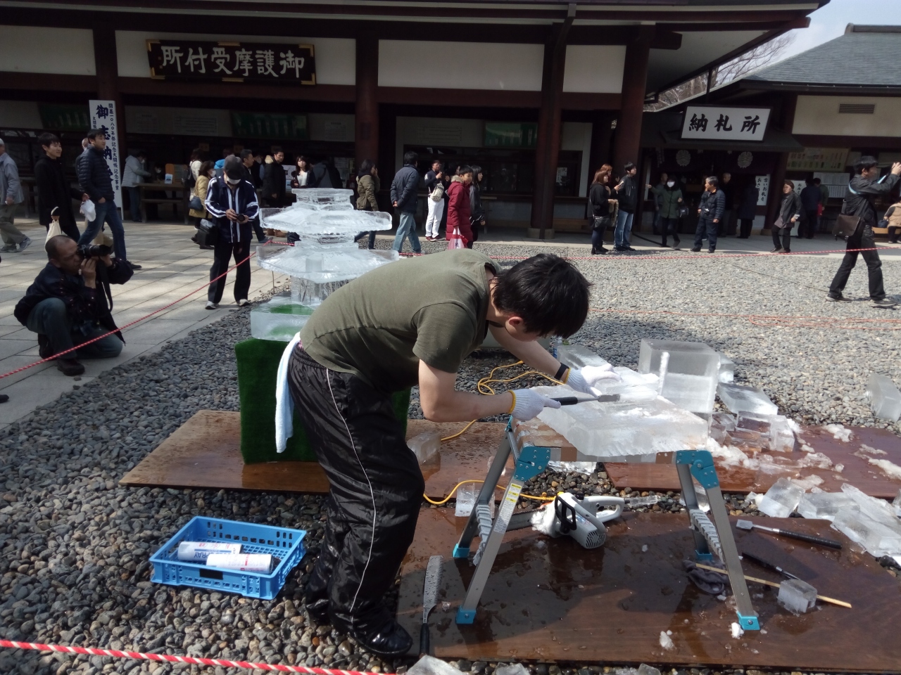 思ったより人手はなく、そんな中、氷彫刻の競技大会を本殿前で行っていました。
