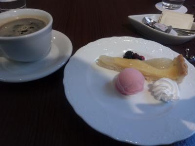 ドルチェは桃のアイスと洋梨のタルト。甘すぎず、こちらもおいしかったです。