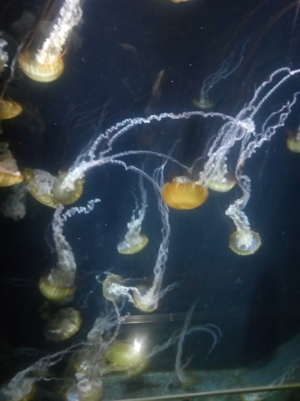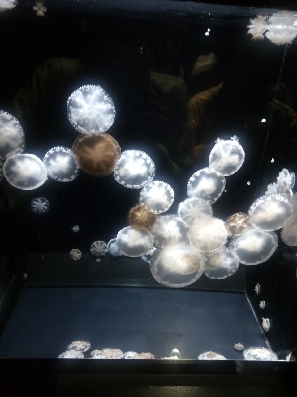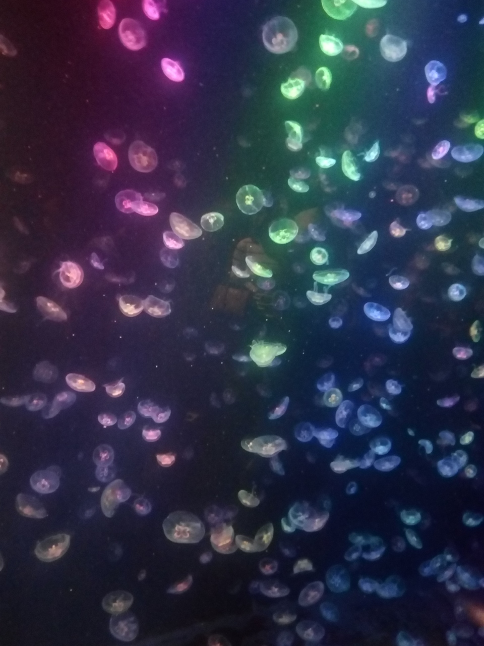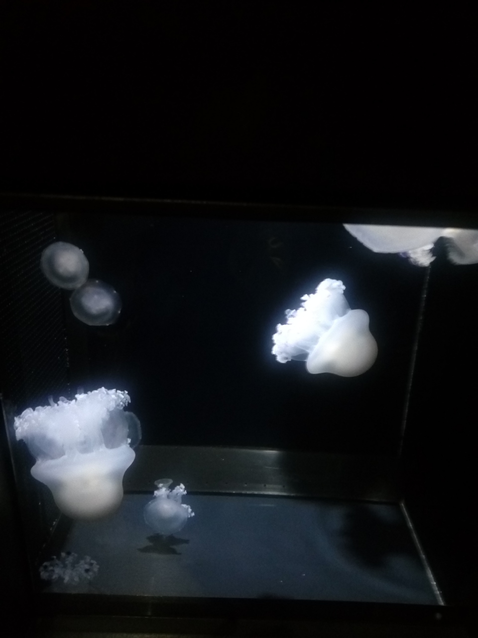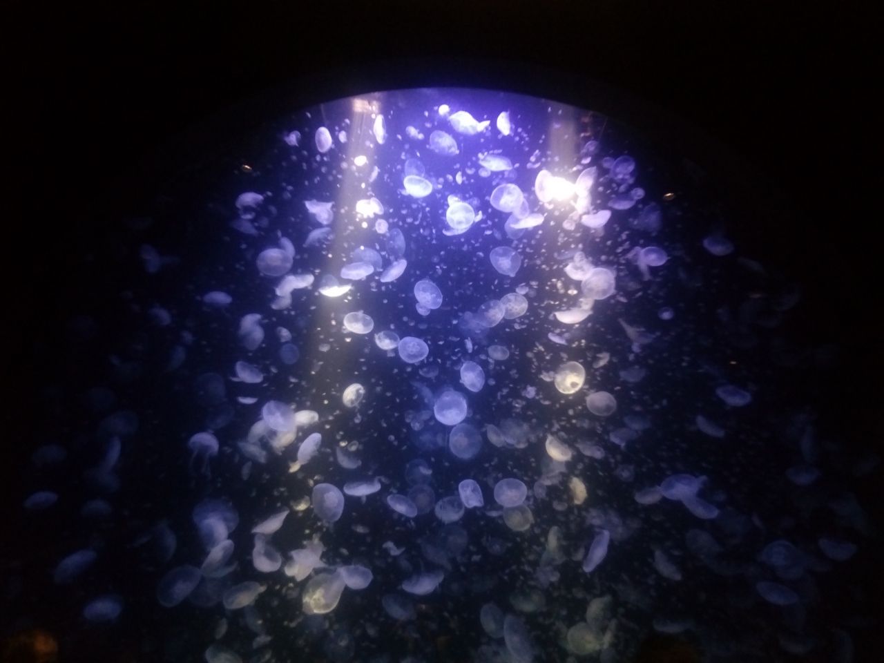 館内はクラゲのエリアになったら、さらに大混雑。普段、見慣れない種類がたくさんあり、日本一大きいとうたっているクラゲエリアの最後になる巨大な水槽は見ものでした。