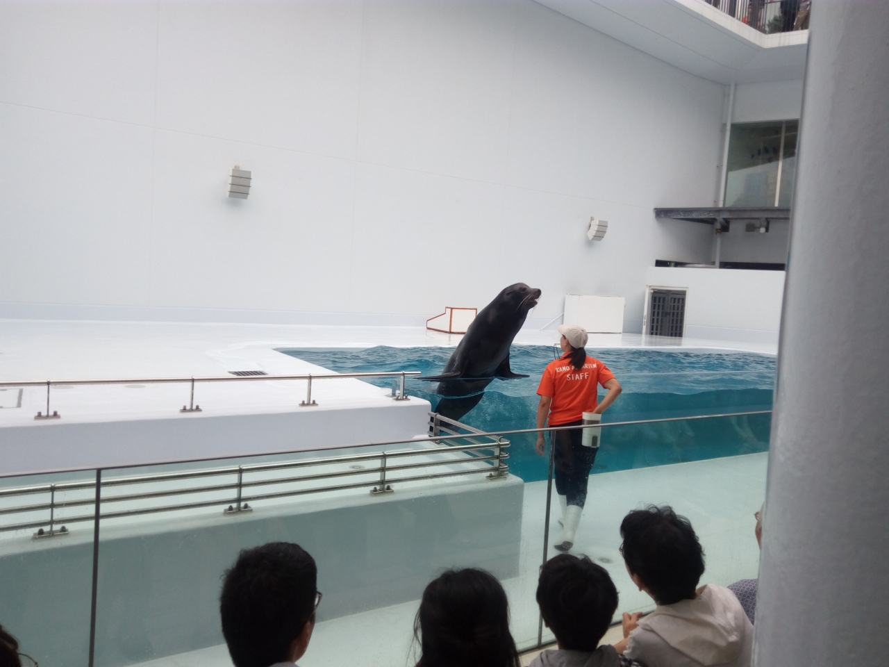 入場券の購入はすんなり買えて、ちょうどアシカのショーが始まるところだったので、展示物を全部すっとばし、順路の一番最後にあるショーの見える椅子のところまで行きました。