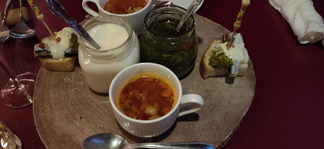 前菜、香草を使ったオリジナルのソース、牡蠣のアヒージョ