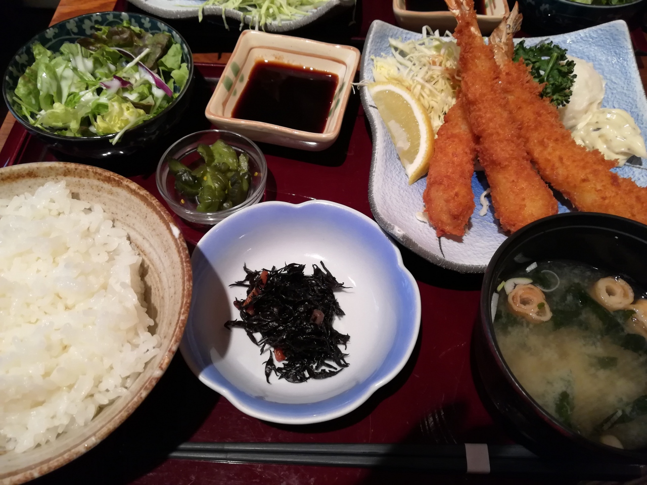 いつものランチメニューにはない、限定エビフライ定食を注文。