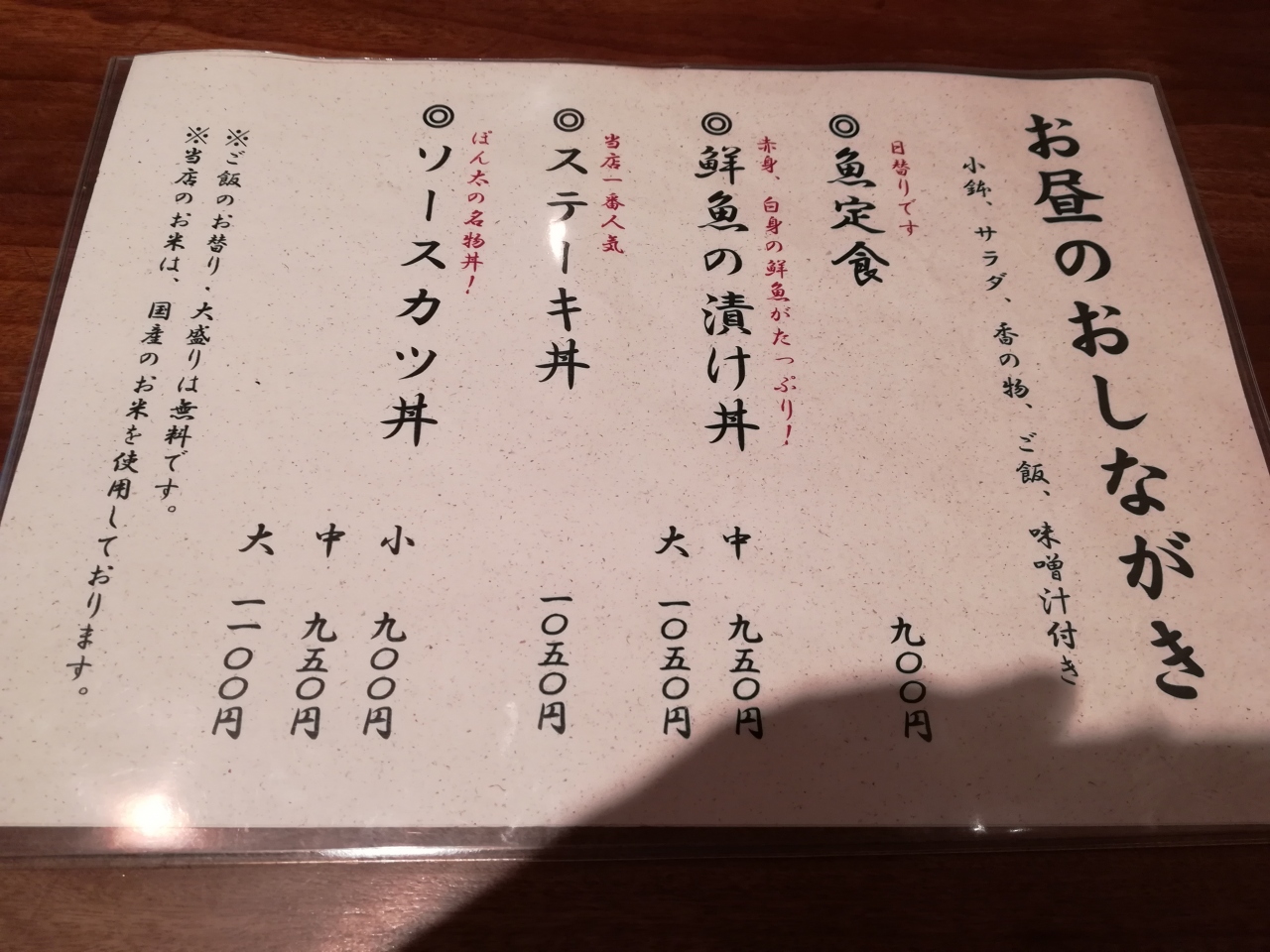 ご飯が、大・中・普通・小で選べますが、値段は一緒。