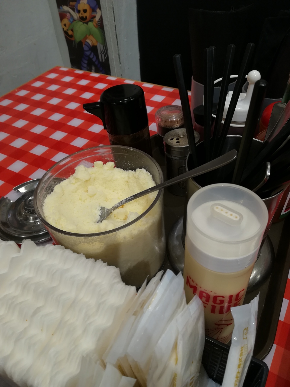 テーブルには、大量の粉チーズと、見たことないサイズのタバスコ。