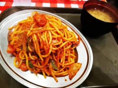 普通盛 400gのナポリタンを注文。なぜか、味噌汁がついてます。