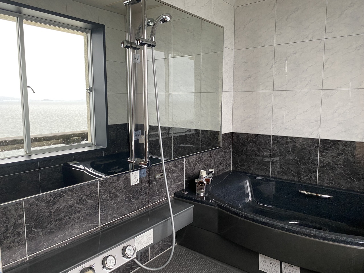 貸切風呂は景色も良く、波の音を聴きながら心地よい時間を過ごせるが、釣り人が多いのでたぶん丸見え。(お部屋のお風呂も同様に)