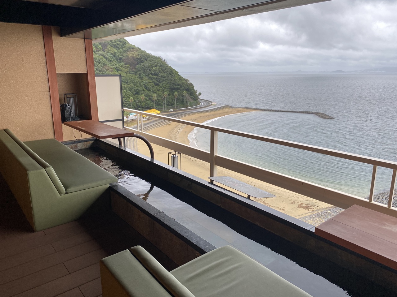 2024年10月に海望閣の9階の半露天風呂付きのお部屋に宿泊しました。