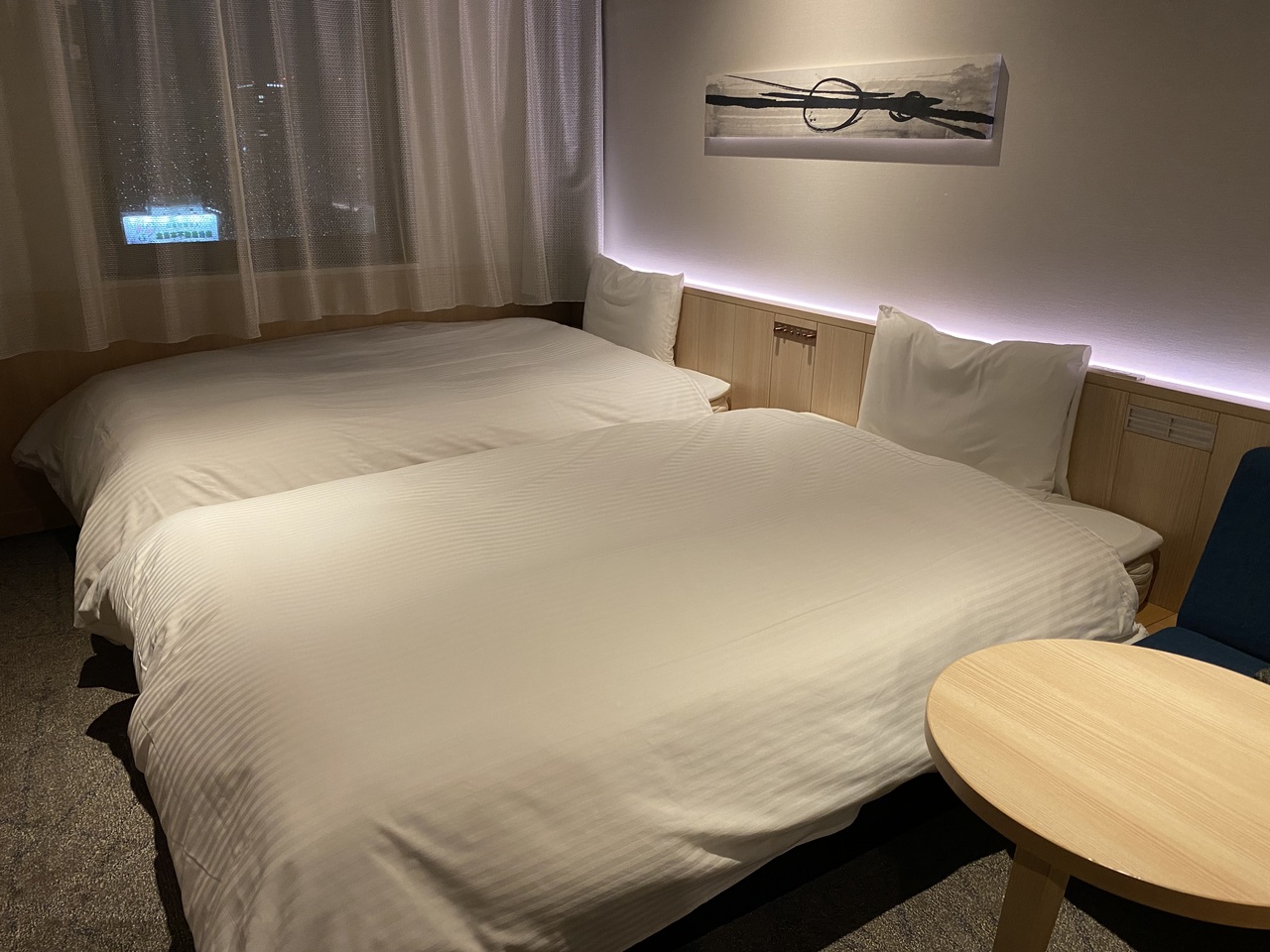 お部屋は清潔でスーツケースを広げても狭さは感じず、ベッドもフカフカ。