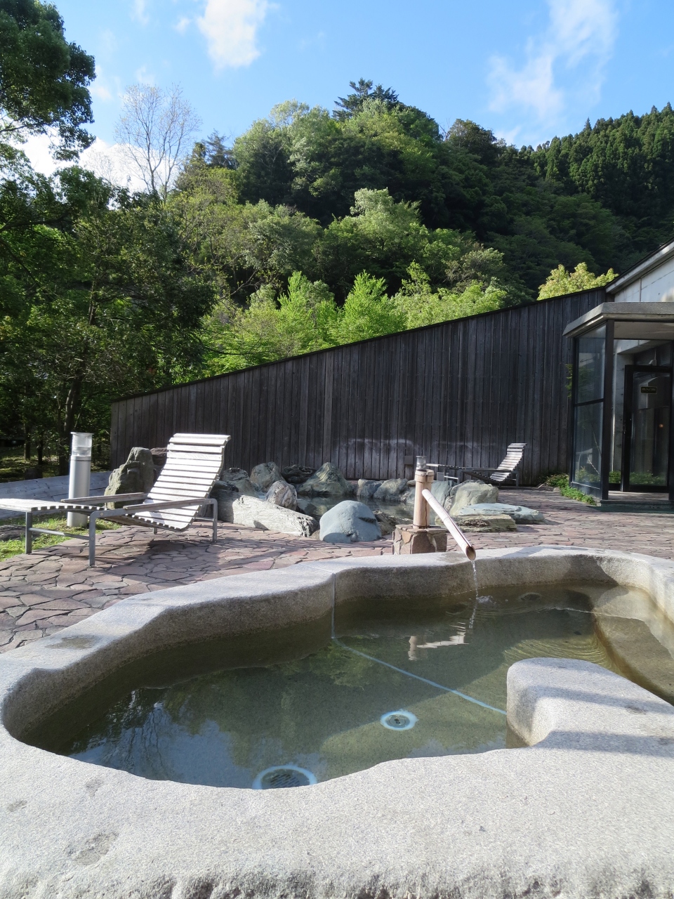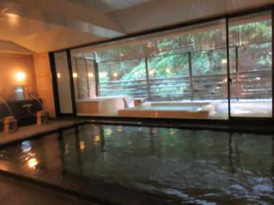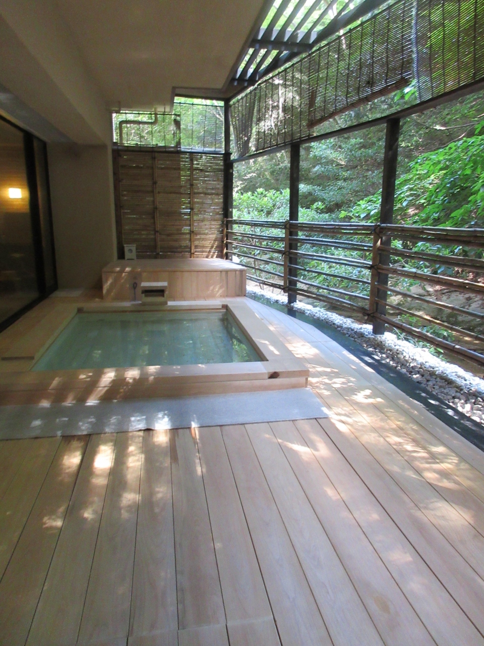 温泉は、中2階にあり混浴露天風呂は、中からつながっていて外にでても立ち上がらなければ金の湯なので見えません。柵もあるので家族同士でしたら露天風呂で会話も出来ます。滞在中はいつでも入浴ができるので早朝ものんびり温泉を満喫しました。朝食は、サロンでいただいたので朝から良い音楽を聞きながら優雅な気分にひたって食事を楽しみました。サロンでは、夕方と朝珈琲のサービスがあります。