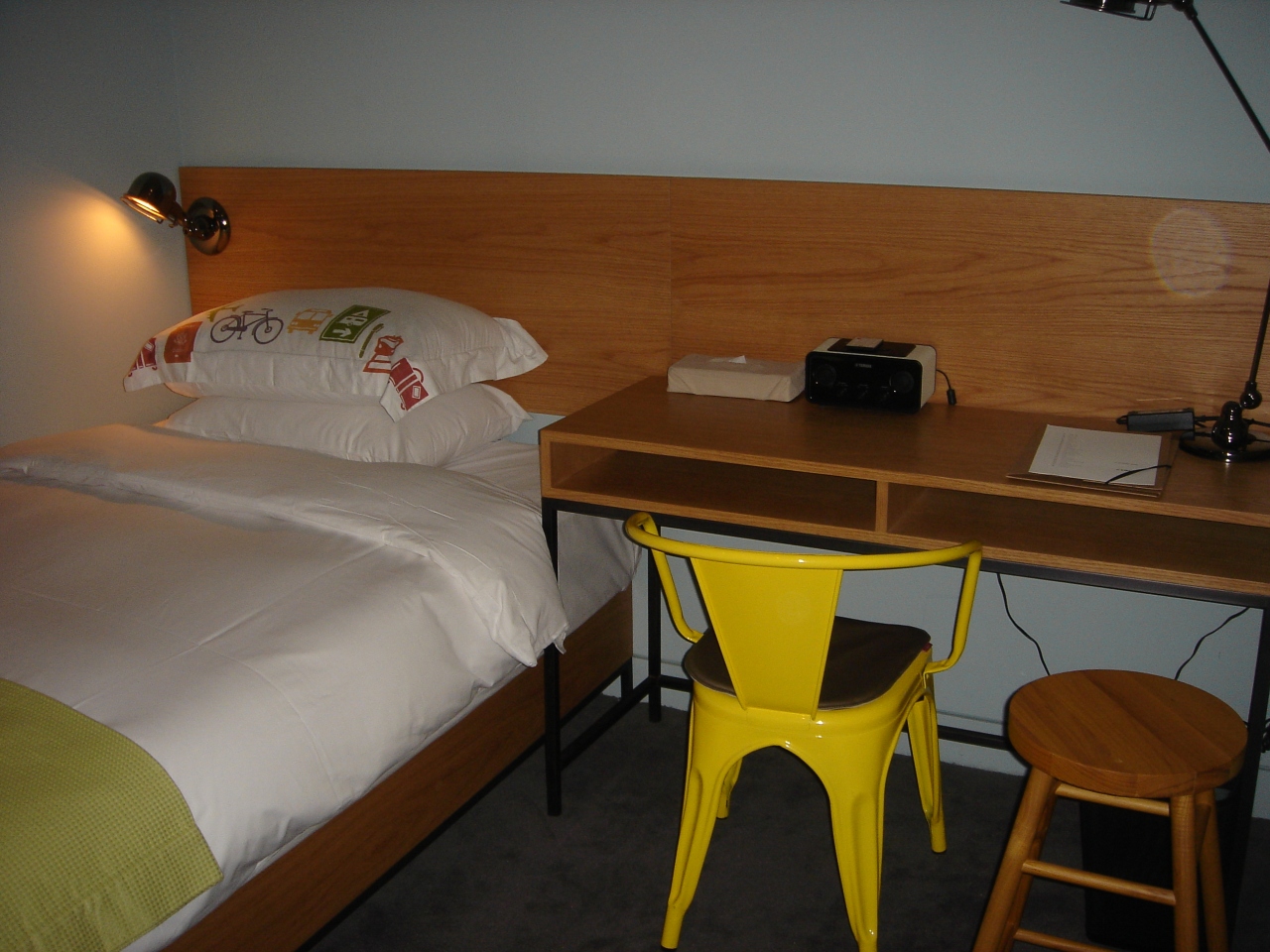 シアトルの空港からバスで少しいったところにあります。フロントが2階ですがエレベーターはなくスーツケースを持って上がらなければいけませんでした。ホテルの中はデザインホテルらしく、シンプルで洗練された雰囲気。部屋も、派手な装飾はありませんが清潔です。友人やカップルで泊まるのにとてもいいと思います。