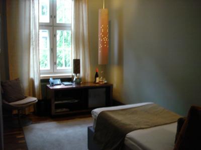 場所は中心部から歩いてすぐのところにあり、大変便利です。ロビーやレストランはお洒落で食器もイッタラ。お部屋も、統一感のある落ち着いた感じで置いてあるランプもかわいかったです。