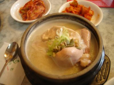 参鶏湯は比較的あっさりめ。それよりなにより、自動で出てくるカクテキがおいしかったです。