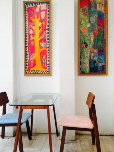 白い壁にカラフルな椅子が並ぶ明るい店内です。