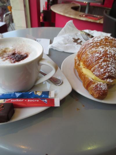 10時前に朝食を取るつもりで行きましたが、時間が早すぎたのか2階は断られてしまいました。仕方なく1階の店舗の端にある小さなテーブルでクロワッサンとカフェラテをいただきました。