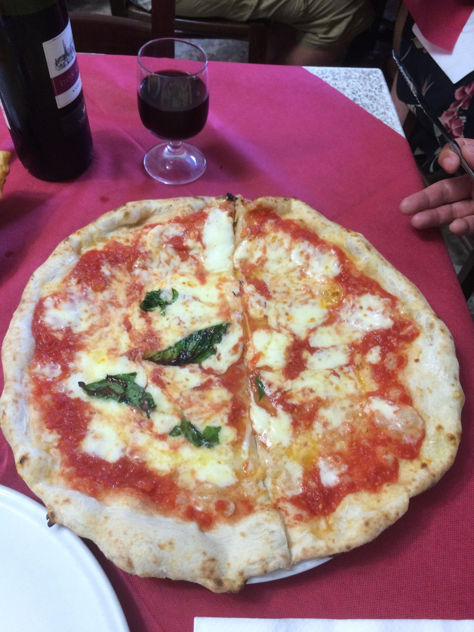 老舗のピッツェリアだったので、期待してナポリ最後の夕食として行った。沢山待っていたので番号がよばれるまで外で待ち、やっと入ったら凄く狭いテーブル席で、ピッツァを食べたら、苦く感じたのでよくよく見たら裏が黒焦げで、食べる気が失せてしまった。まわりを見渡したら、他の外国人らしきお客さん達も残していて、ピッツァ職人の焼き方が悪いのだと思った。ナポリの最後の夜が、こんな感じとなりすごく残念でした。