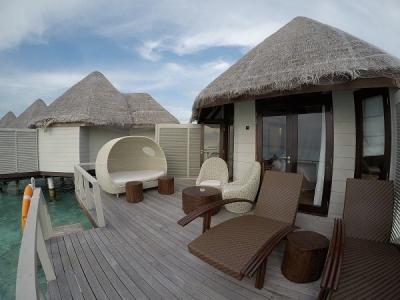 水上コテージ内は、ベッドルーム、バスルーム、そして海に直接入れるデッキ、というつくり。白を基調としたすっきりとしたインテリア。アメニティは必要最低限。ペットボトル水は毎日2本。ネスプレッソもありました。この環境だから仕方ないかもしれませんが、水圧は不安定で、連続して使うとお湯が冷水になります。