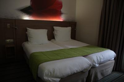 レンヌ駅の街の中心方面の出口に出て、すぐ目の前の左手にあります。駅近は便利。お昼に着きましたが、ラッキーなことに部屋に入れてもらえました。部屋はツインベッドのまわりにそれほど余裕はない広さですが、デスク、ハンガーラック、冷蔵庫などもコンパクトながらひととおりそろっています。バスルームも清潔でバスタブも付いていました。リーズナブルな割に快適に過ごせました。