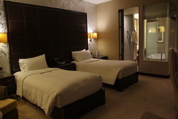 豪華なパブリックエリアに比べて客室は割と普通ですが、バスタブ付きだし、無料のミネラルウォーターもありました。