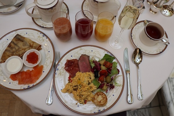 特筆すべきは朝食。広くてゴージャスな空間で、スパークリングワインを飲みながら、イクラやサーモンを乗せたブリヌイやローストビーフ、生ハムなどをいただくと、最高に優雅な時間を過ごせます。