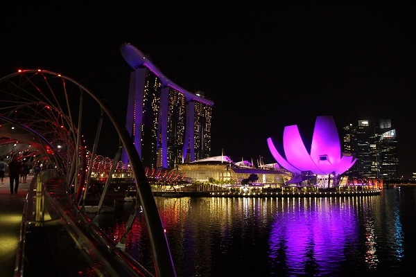 マーライオン公園からこの橋を渡ってマリーナ・ベイ・サンズに向かうコースは、かなりの距離を歩きますが、特に夜景が美しいんのでおすすめです。マリーナ・ベイ・サンズがだんだん近づいてきて迫力を増すのを見ながら歩くのが楽しいです。