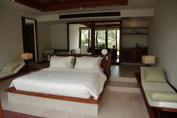 ベッドルームは真ん中に大きなダブルベッドがしつらえられ、両壁にそれぞれソファがあり、手前の窓際のテレビは収納式になっています。ベッドヘッドの奥にはテーブル&チェアがあり、その奥の壁面の真ん中がクローゼット、右がミニバー、左が机になっています。