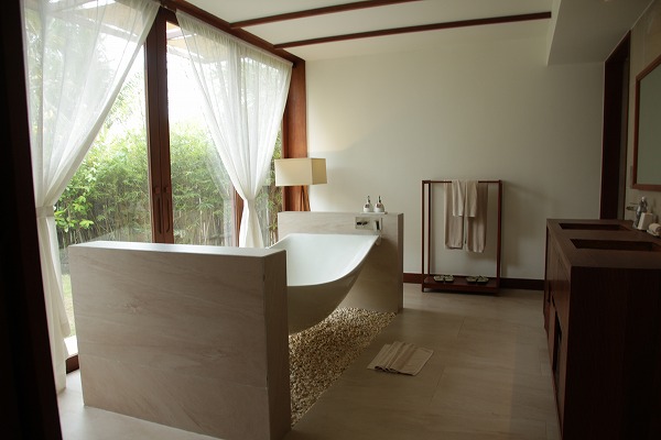 バスルームの中央には名物の宙に浮く白いバスタブ。ダブルシンクの洗面台の両脇にはトイレ、シャワーがそれぞれあります。