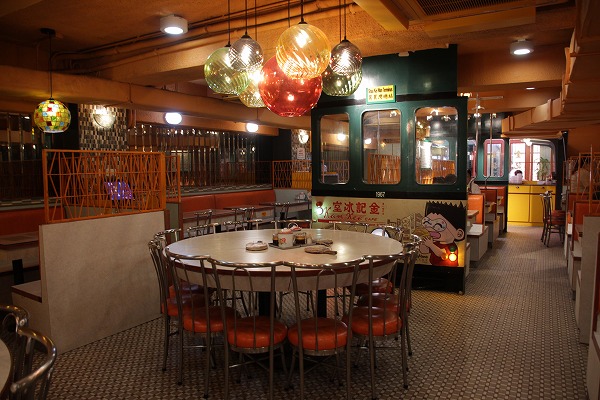銅鑼湾店はトラムをテーマにした内装。グリーンの車体に迎えられて店内に入ると、バスの座席を模したテーブルが並ぶオレンジ色を基調とした空間が広がっています。奥には大きめの丸テーブルがいくつか置かれ、カラフルな照明、細かいタイル貼りの床、壁の黒板などがノスタルジックな雰囲気を醸し出しています。