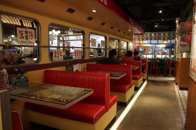 インスタ映えスポットとして有名で、店内はバスっぽいつくりと学校っぽい演出が混ざっています。タイル貼りの床、真っ赤なビニールシート、漢字の看板などレトロな雰囲気を出しながらも、どこかポップに仕上げています。