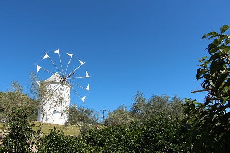 ギリシャ風の真っ白な風車が濃い緑のオリーブの木に囲まれ、抜けるような青空に映えます。眼下には瀬戸内海が見下ろせ、とても開放的な空間。