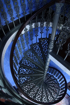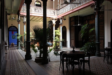 この建物は7番目の妻のために建てたもので、部屋数は38、中庭は3つあり、左右対称につくられています。ヨーロッパから取り寄せたステンドグラスやタイルと中国の陶器や家具が融合した折衷様式で、前方が海で後方が山(ペナンヒル)という立地条件から魔除けのコウモリモチーフや気を集める石などの細部に至るまで風水が取り入れられているとのこと。