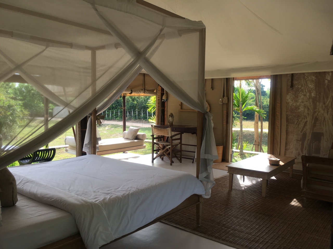 全10室以下の客室はすべてテントヴィラになっており、帆布で覆われた建物に蚊帳のついたダブルベッド、ソファ、デスクが配され、バスルームは反屋外。日中は帆布のロールカーテンをすべて上げると、周囲の自然と一体となって開放感抜群。スイングソファもあってくつろげます。