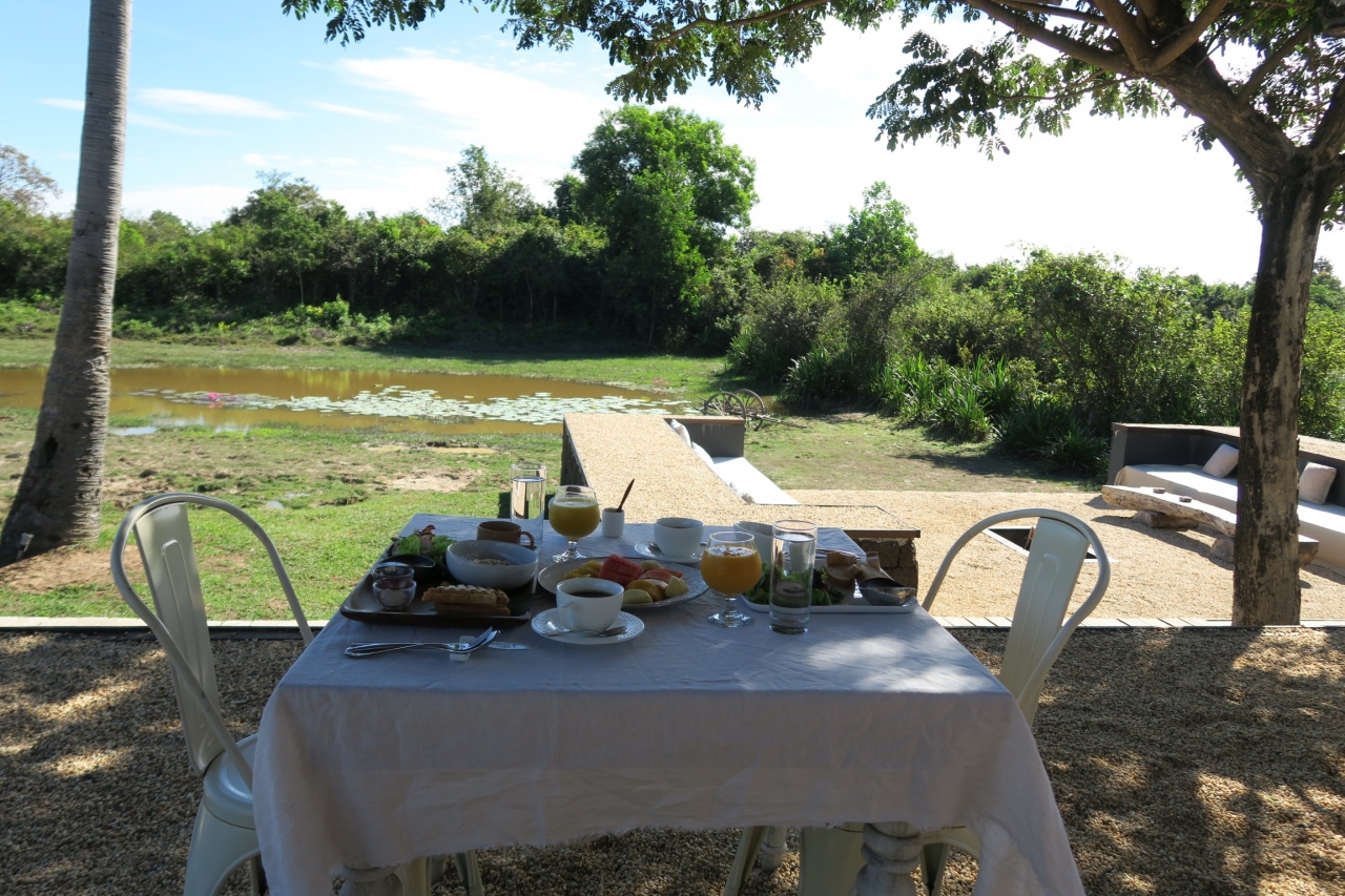水田が広がる敷地内には水牛が闊歩する一方で、レセプションやレストランの入ったメイン棟は白を基調にしたスタイリッシュなインテリア。