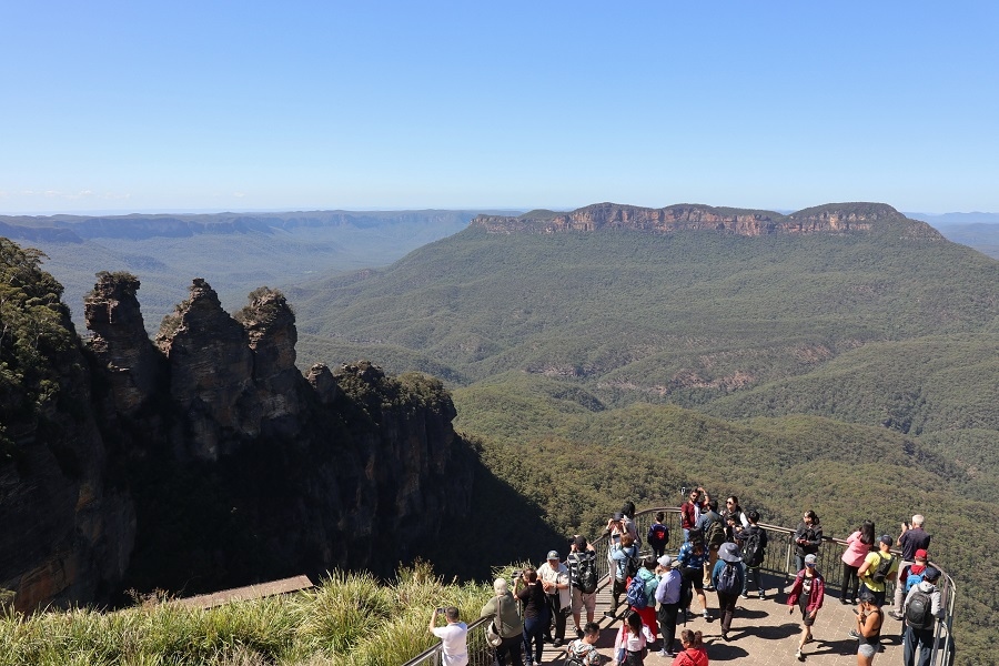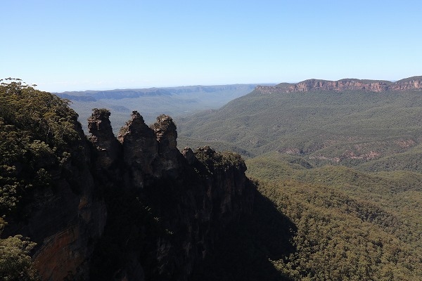 シドニーから人気の日帰りスポットであるブルーマウンテンズの一番有名な景勝スポットが、エコーポイントの展望台から眺めるスリーシスターズと呼ばれる3つの岩です。