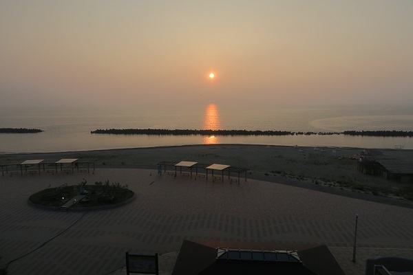 新潟県村上市の瀬波温泉は夕日の名所として知られていますが、こちらのお宿はそれを全面的に売りにしています。
