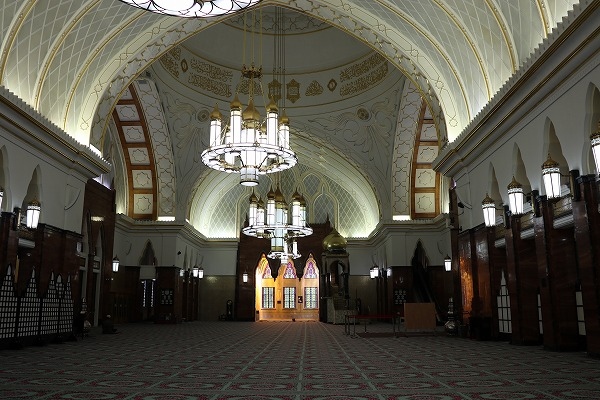 階段を上がると、真っ白な空間にところどころ金色のシャンデリアがアクセントになっていて美しいです。そして階段の目の前のドアを開けるとお祈りの部屋。この室内は撮影禁止なのが残念ですが、オールドモスクの親しみやすいインテリアとは対照的に、広くてすっきりと洗練されたデザインでした。