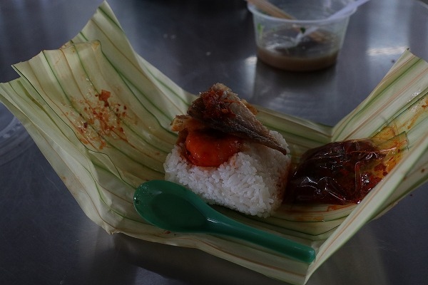 葉っぱに包まれた白いご飯に魚と薄焼き卵、サンバルを乗せて食べるものがおいしかったです。ピーナッツとシュガーをまぶしてレーズンを散らしたパンケーキも、熱々のうちがおいしいB級スイーツでした。- 旅行時期