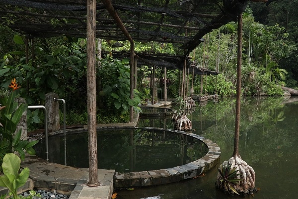 パブリックエリアも充実。深い緑に囲まれた大きな池の端に、4つほど家族風呂のように仕切られた温泉があります。正直言って単なる温かいお湯という感じで湯質は微妙ですが、開放感があってリラックスできます。温泉のすぐ裏手には、小石を敷き詰めたリフレクソロジー風呂と、角質を食べてくれるドクターフィッシュが泳ぐお風呂もありました。